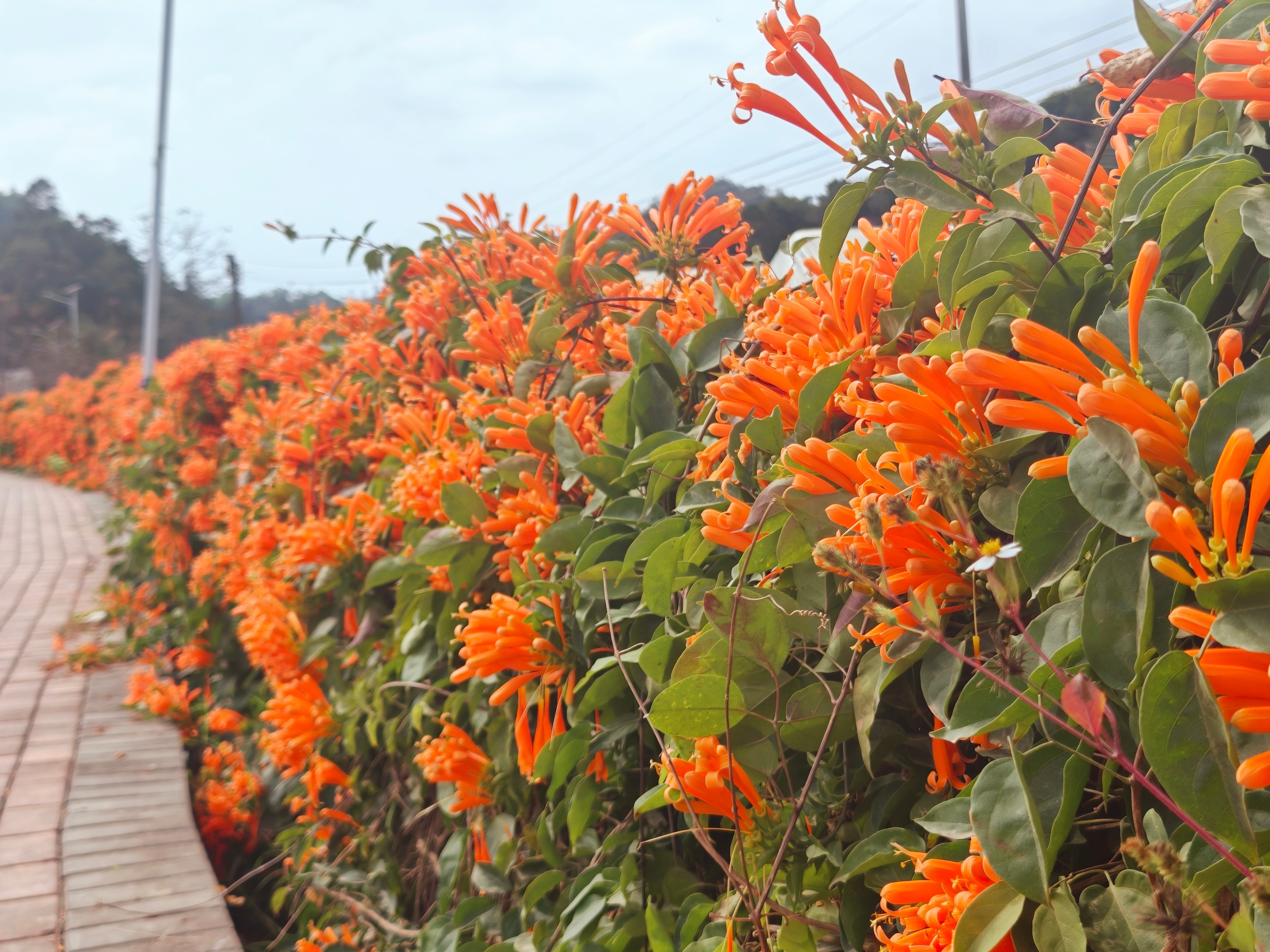 如果说格桑花是安静的美少女,那炮仗花就是最闹腾的“显眼包”。你看那橙红色的花朵,一串一串、一挂一挂、密密麻麻地地在墙面上垂下来,像极了过年没放完的鞭炮,热烈又奔放。它们趴在墙头,仿佛在对着来往的行人喊:“快看快看!春天被我承包啦!”站在花墙下拍照,每一张都是“春日氛围感”拉满的大片!那片生机勃勃的橙色,瞬间就能点燃你的多巴胺。